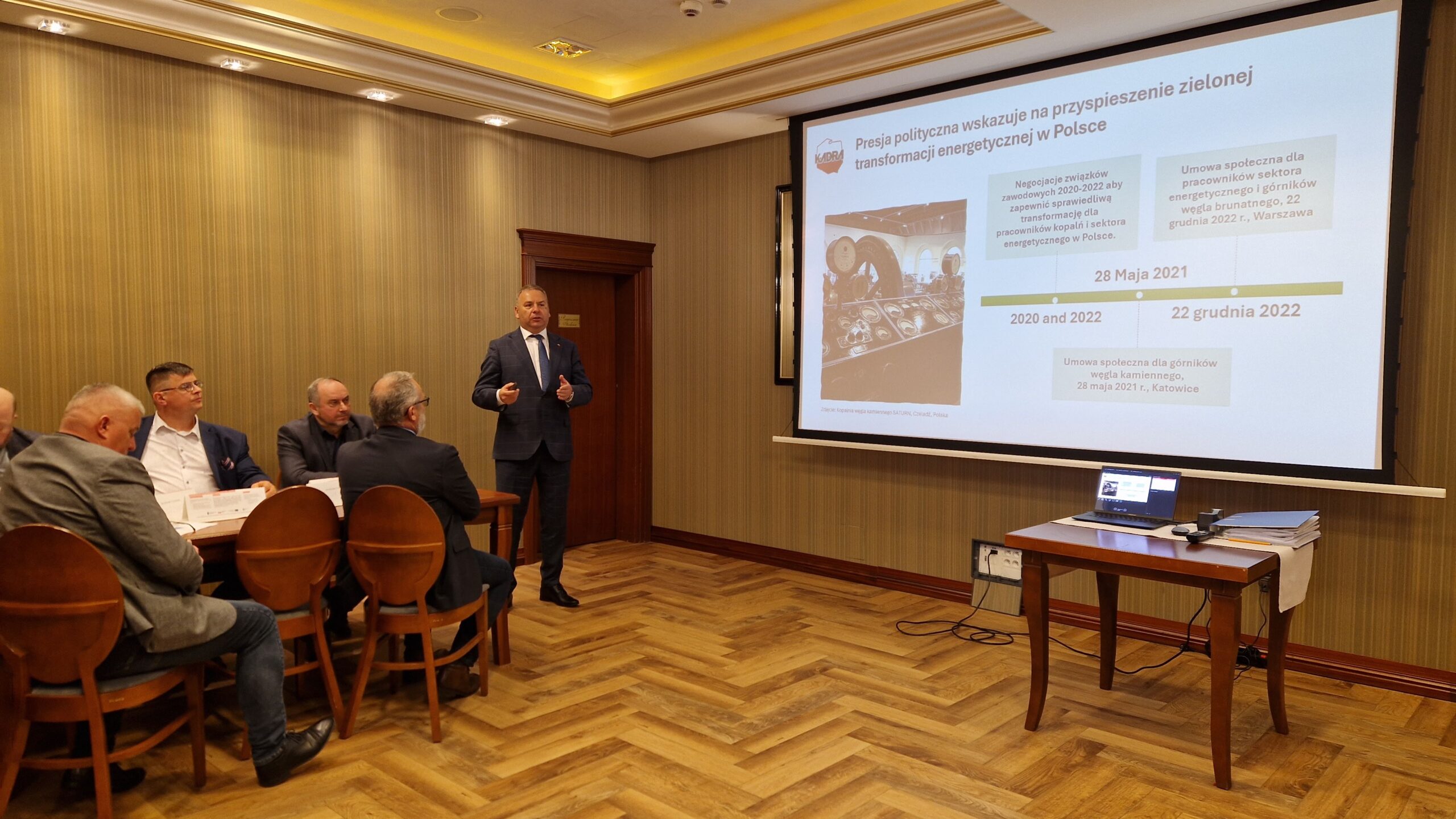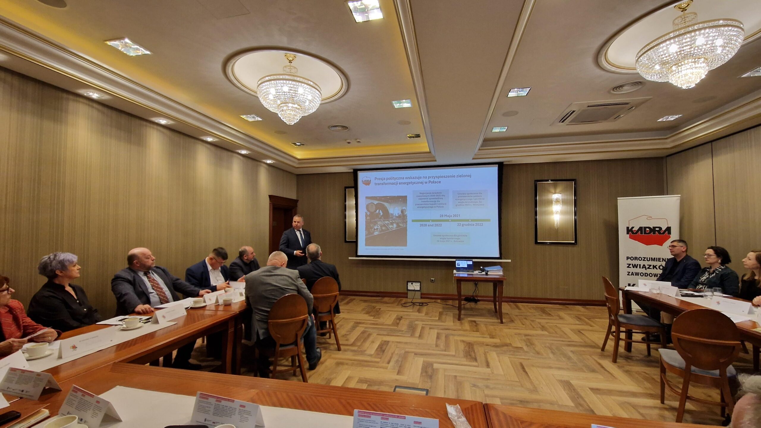 Grzegorz Trefon w imieniu PZZ „KADRA” przedstawił założenia projektu i dobre praktyki sprawiedliwej transformacji z działalności związków zawodowych, a także długoletnie prace służące przygotowaniu koncepcji sprawiedliwej transformacji w Polsce i Europie, podejmowane kampanie związków zawodowych na rzecz sprawiedliwej transformacji dla pracowników.