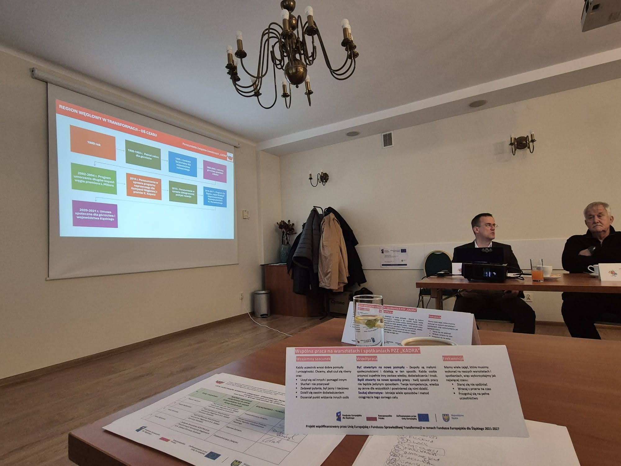 Na początku warsztatu Grzegorz Trefon i Krzysztof Stanisławski w imieniu PZZ „KADRA” przedstawicieli założenia projektu i dobre praktyki sprawiedliwej transformacji z działalności związków zawodowych.
