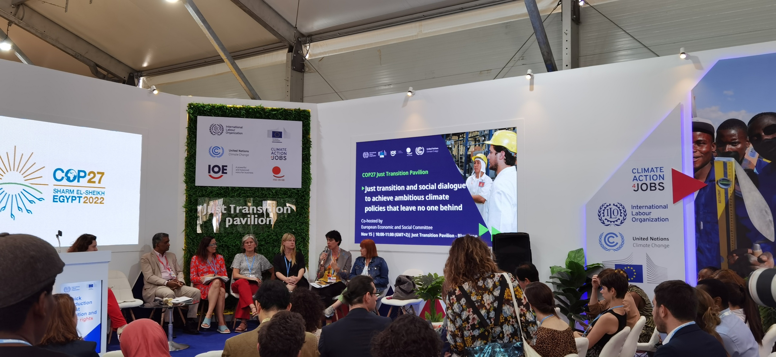 Na wielką uwagę zasługuje działalność Międzynarodowej Organizacji Pracy (MOP) w czasie COP27, która wraz z ITUC posiadała pierwszy raz swój własny pawilon (Pawilon Sprawiedliwej Transformacji), który pozwalał na organizację licznych spotkań środowiskom pracowników, pracodawców i NGO. Pawilon gościł m.in. związkowców i przedstawicieli związków zawodowych z Europejskiego Komitetu Ekonomiczno-Społecznego, którzy dyskutowali o sprawiedliwej transformacji i dialogu społecznym w związku z procesem osiągania ambitnych celów polityki klimatycznej.